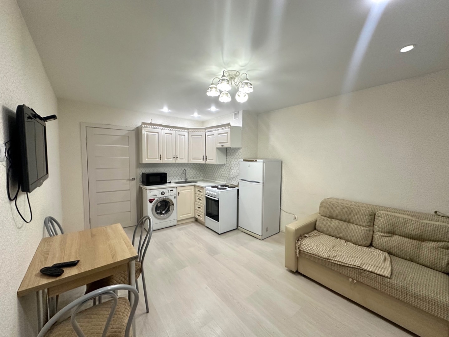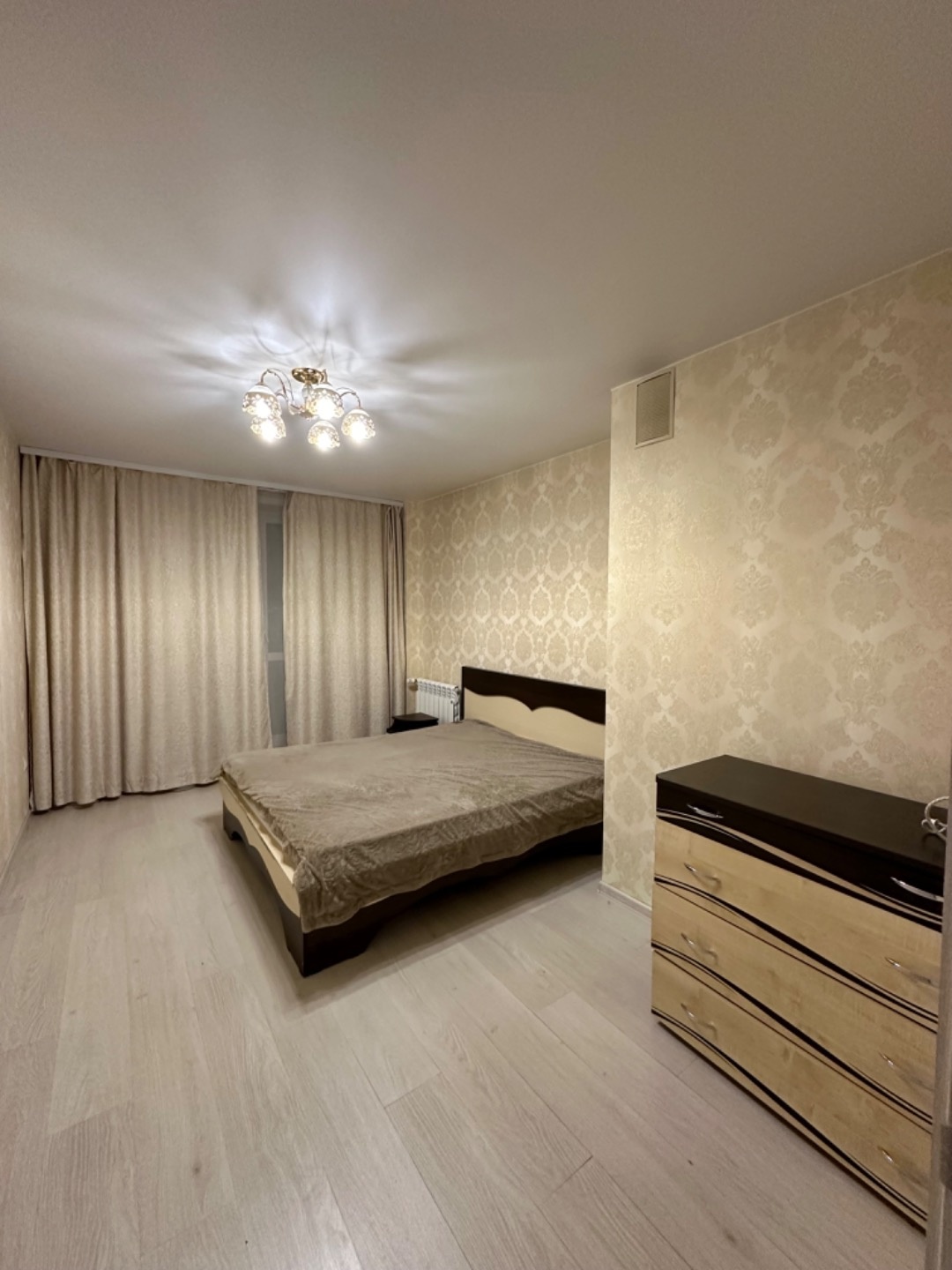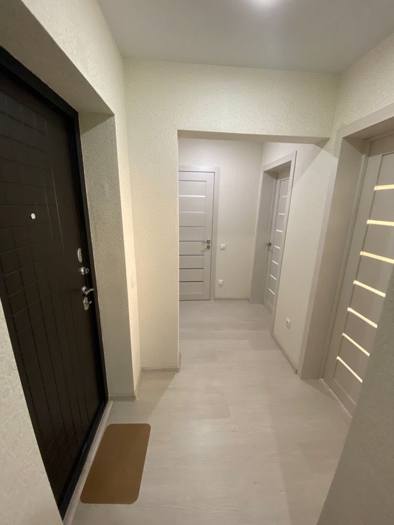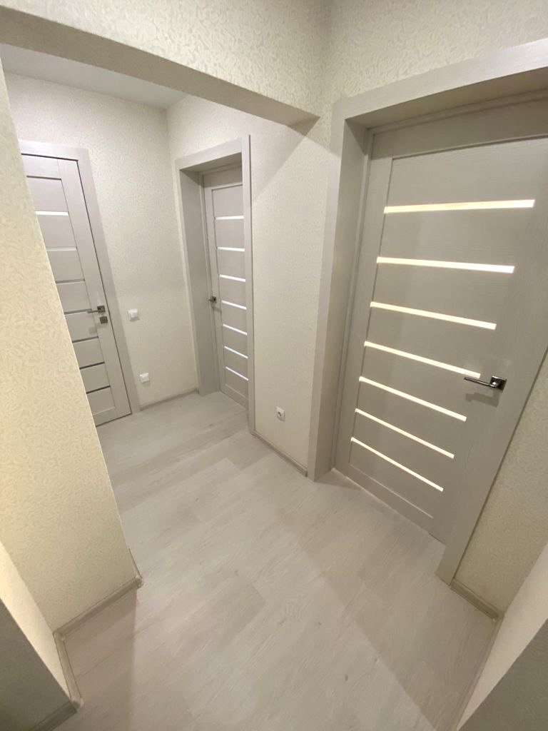 - Все стены выровнены, уложен ламинат. Во всех комнатах натяжные потолки со встроенными светильниками.