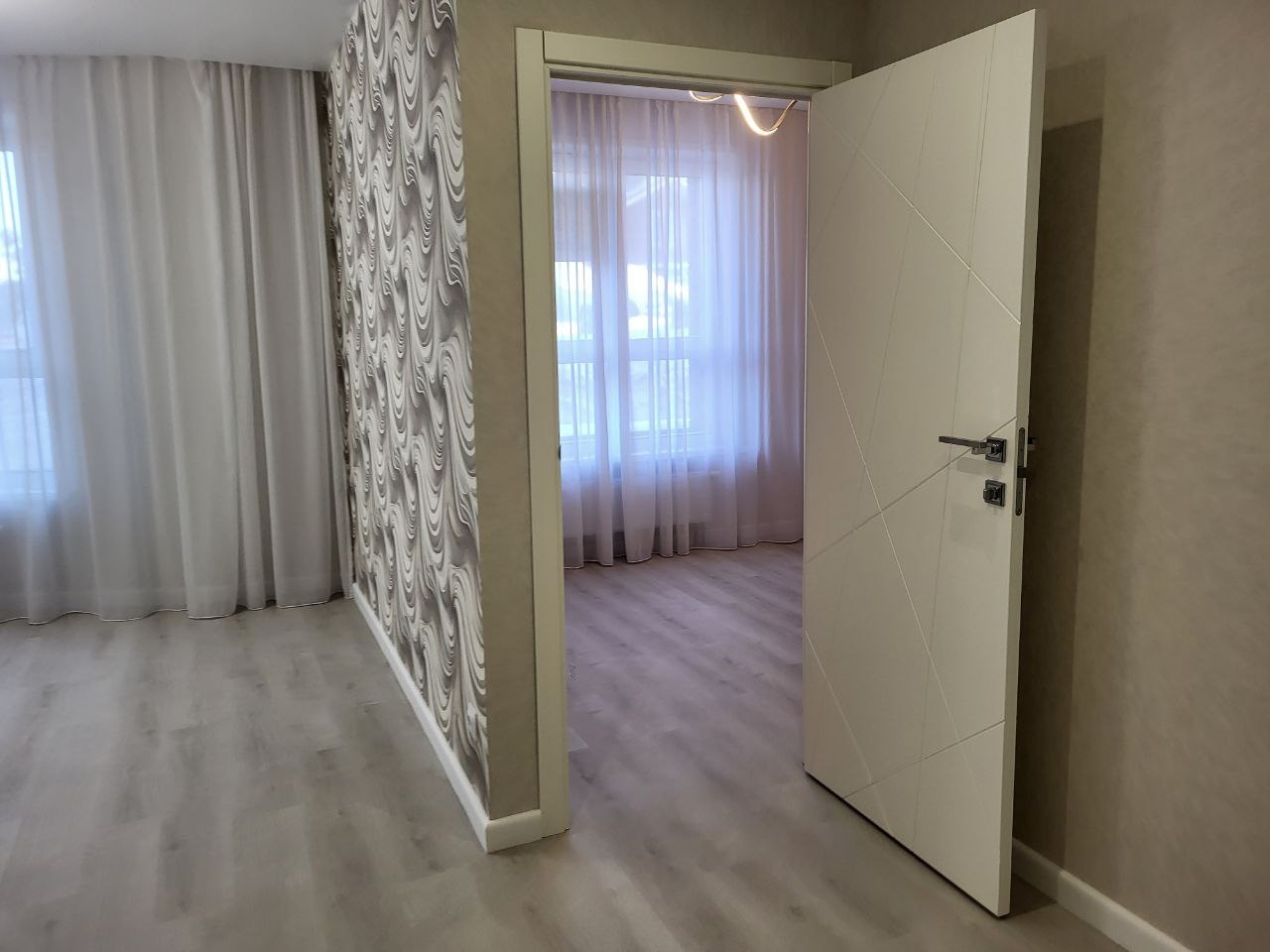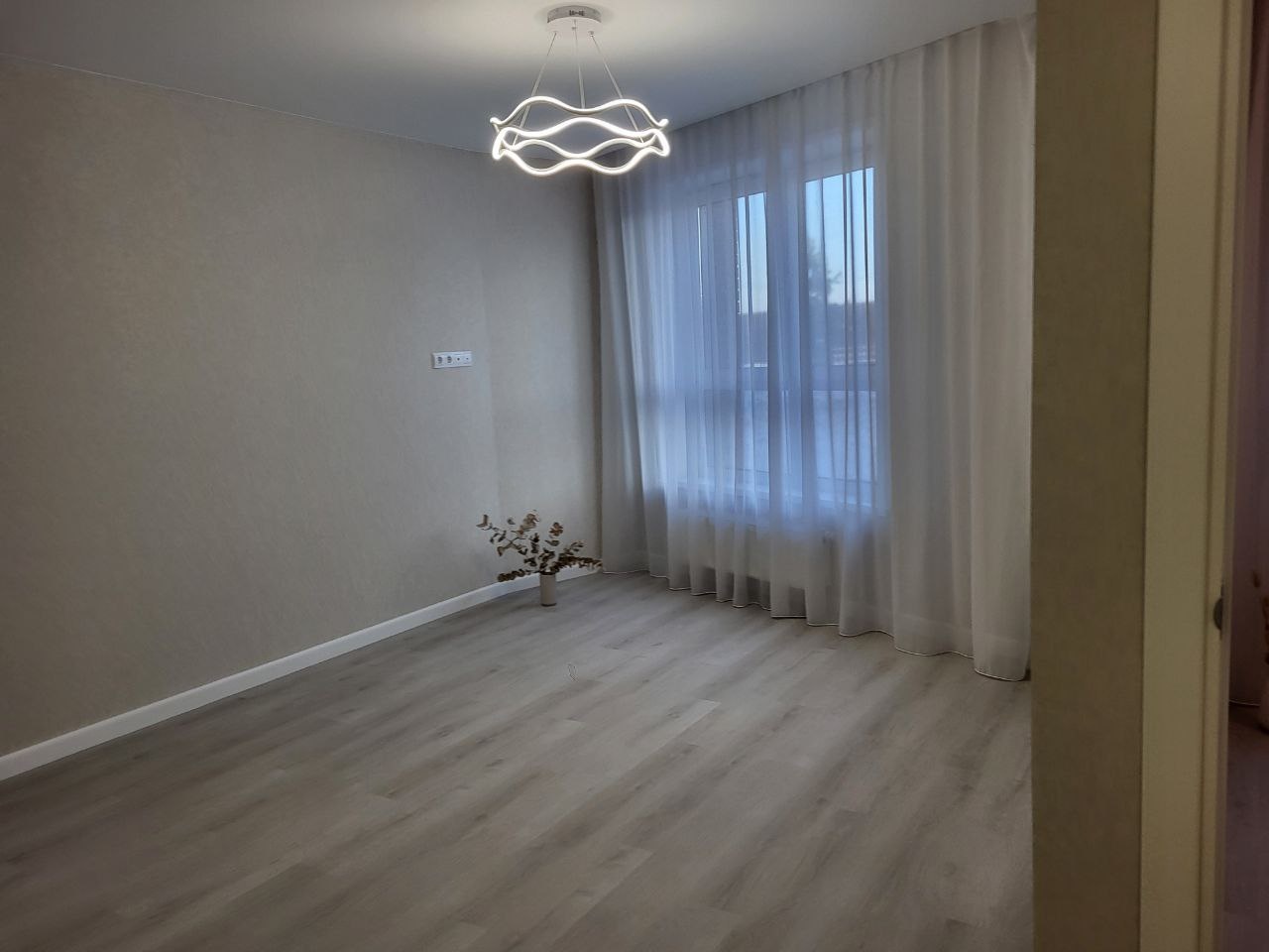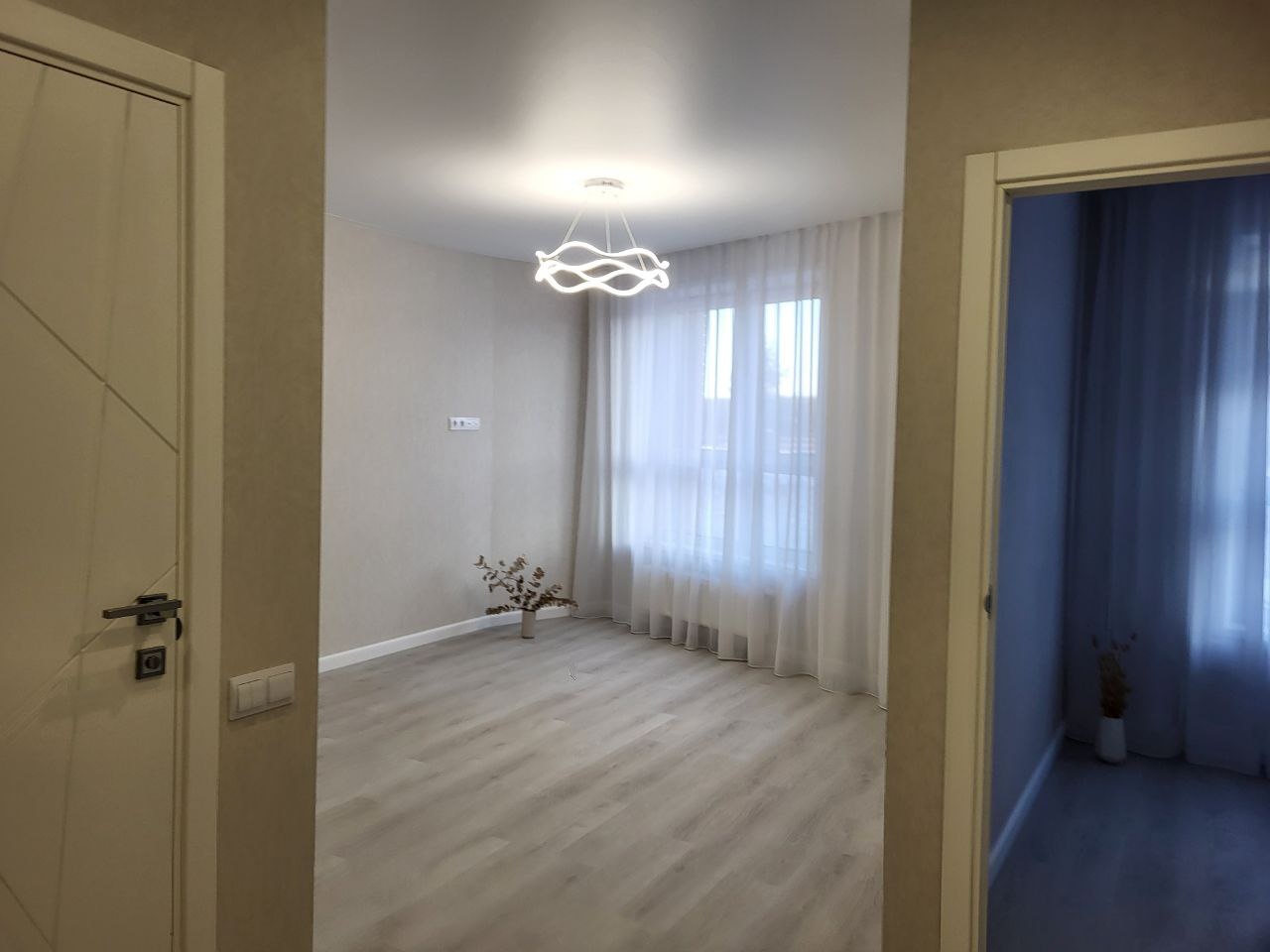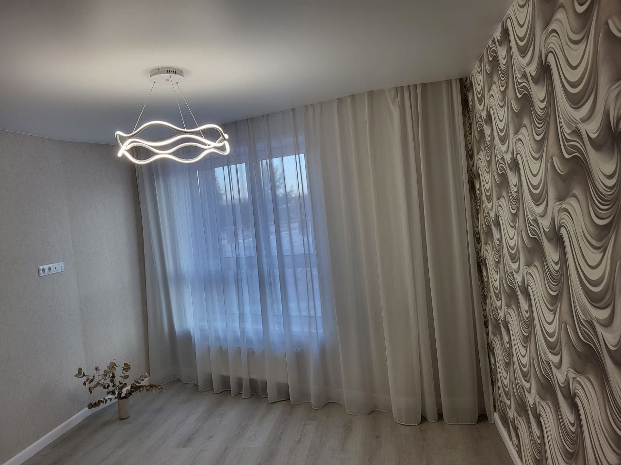-на стенах обои и светодиодные люстры