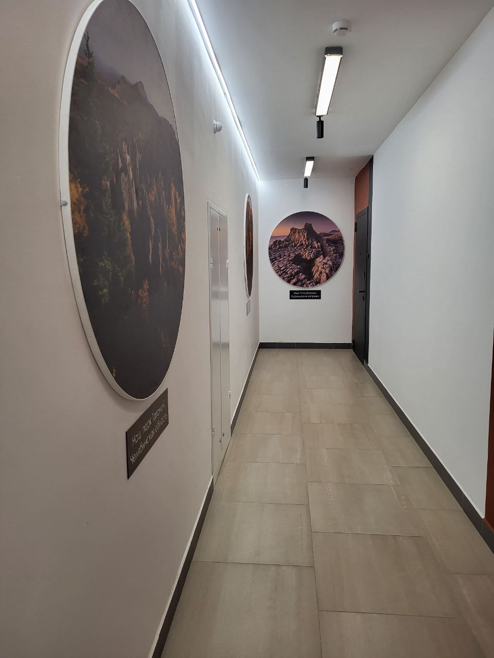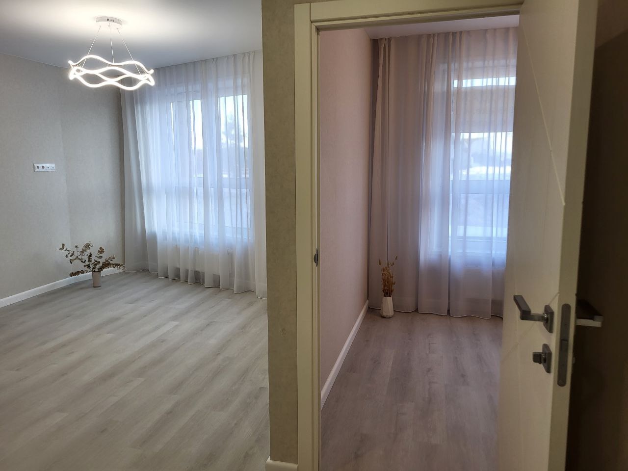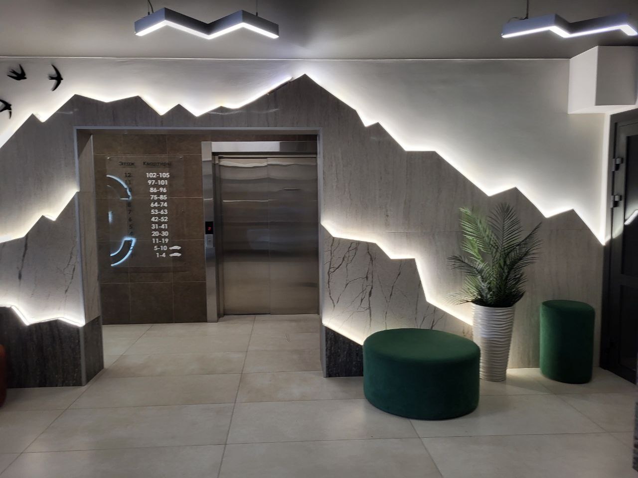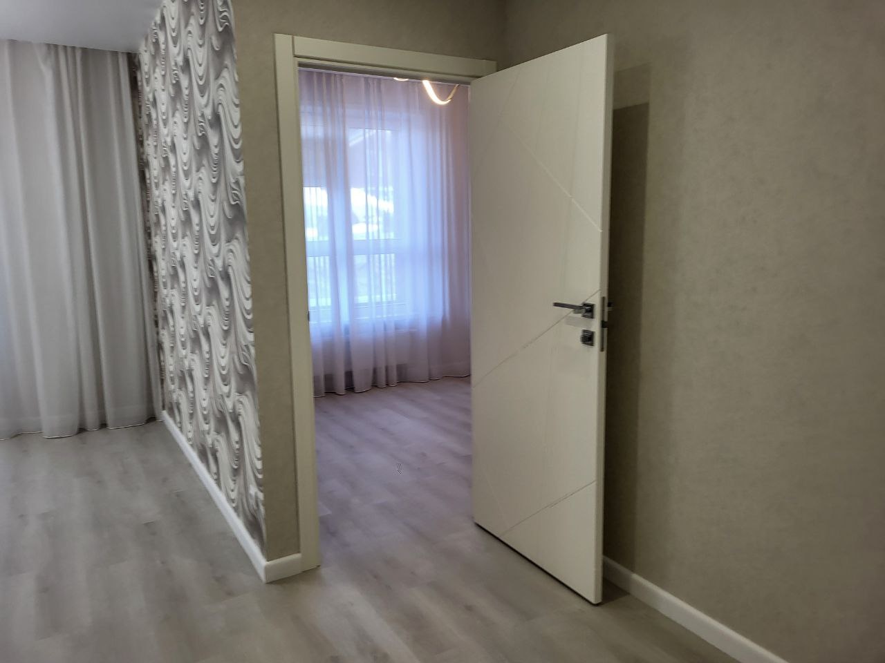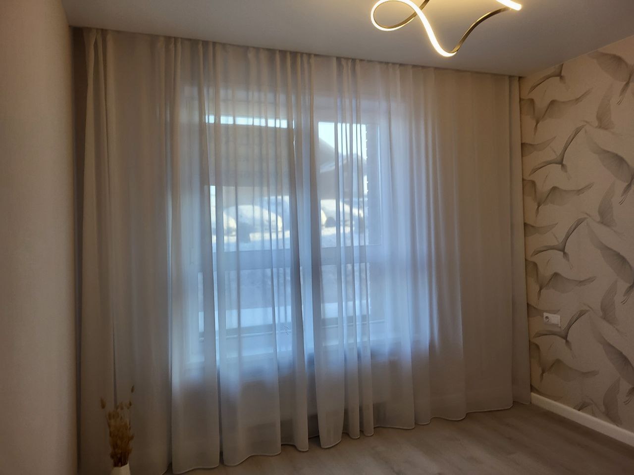 -на стенах обои и светодиодные люстры
