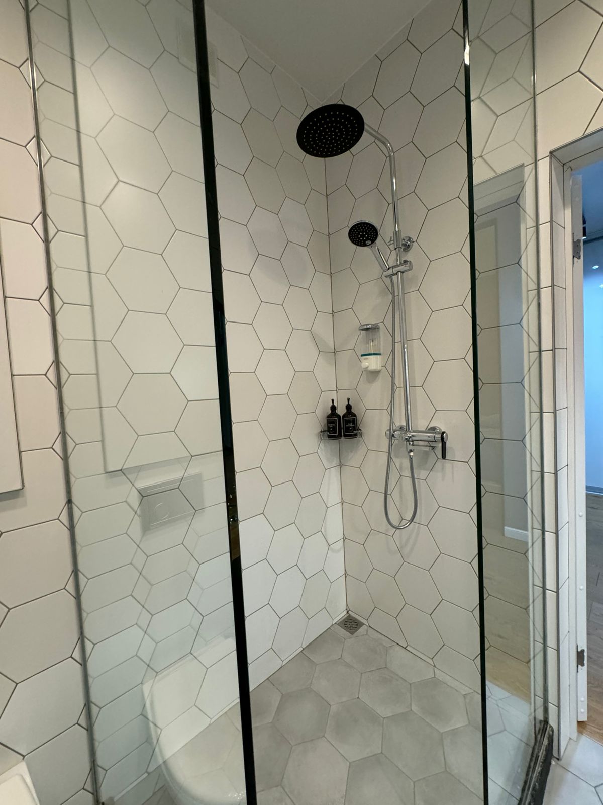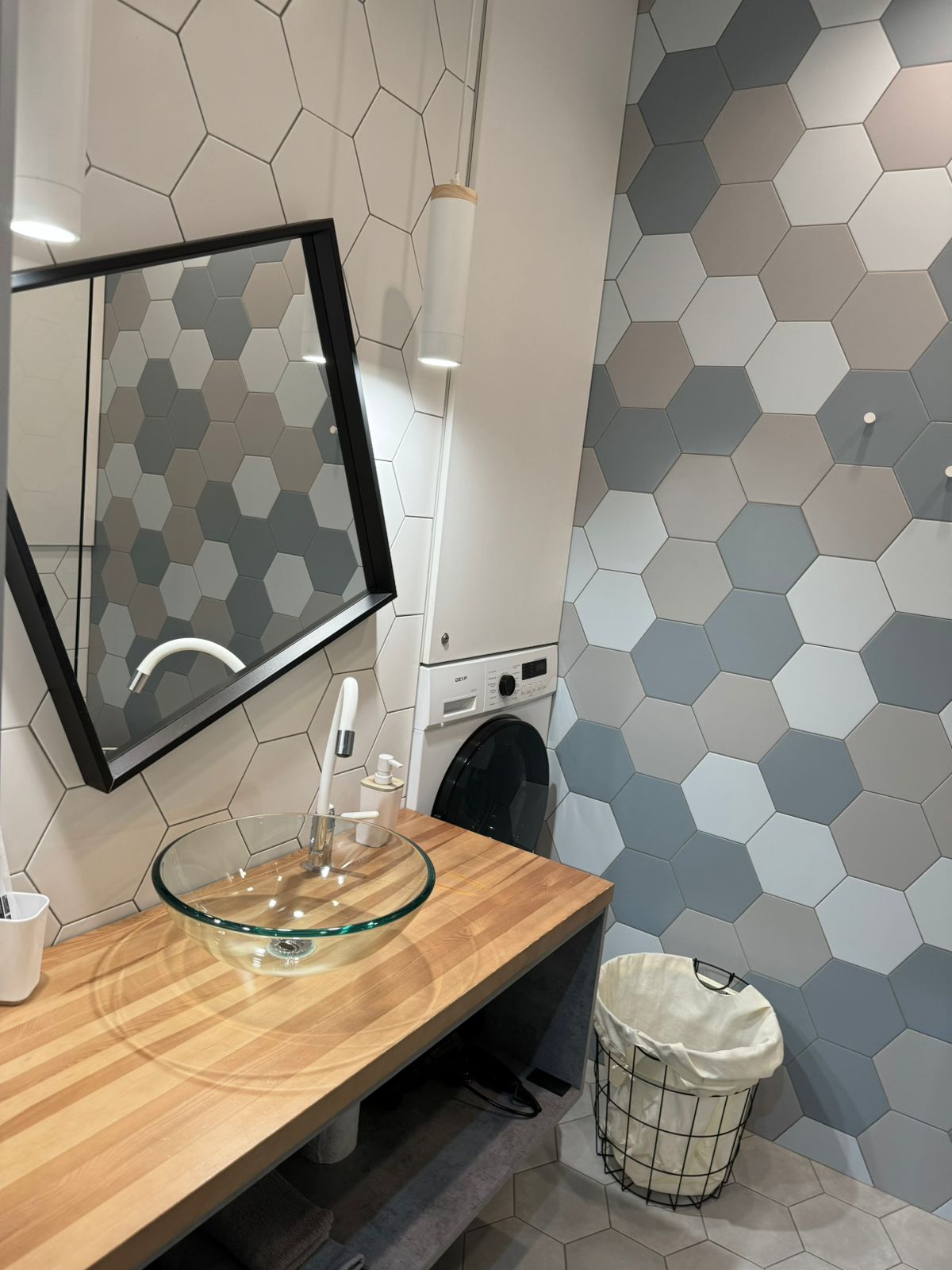 Санузел с душевой кабиной, раковиной, зеркалом, смесителем, шкафами для хранения и стиральной машиной.