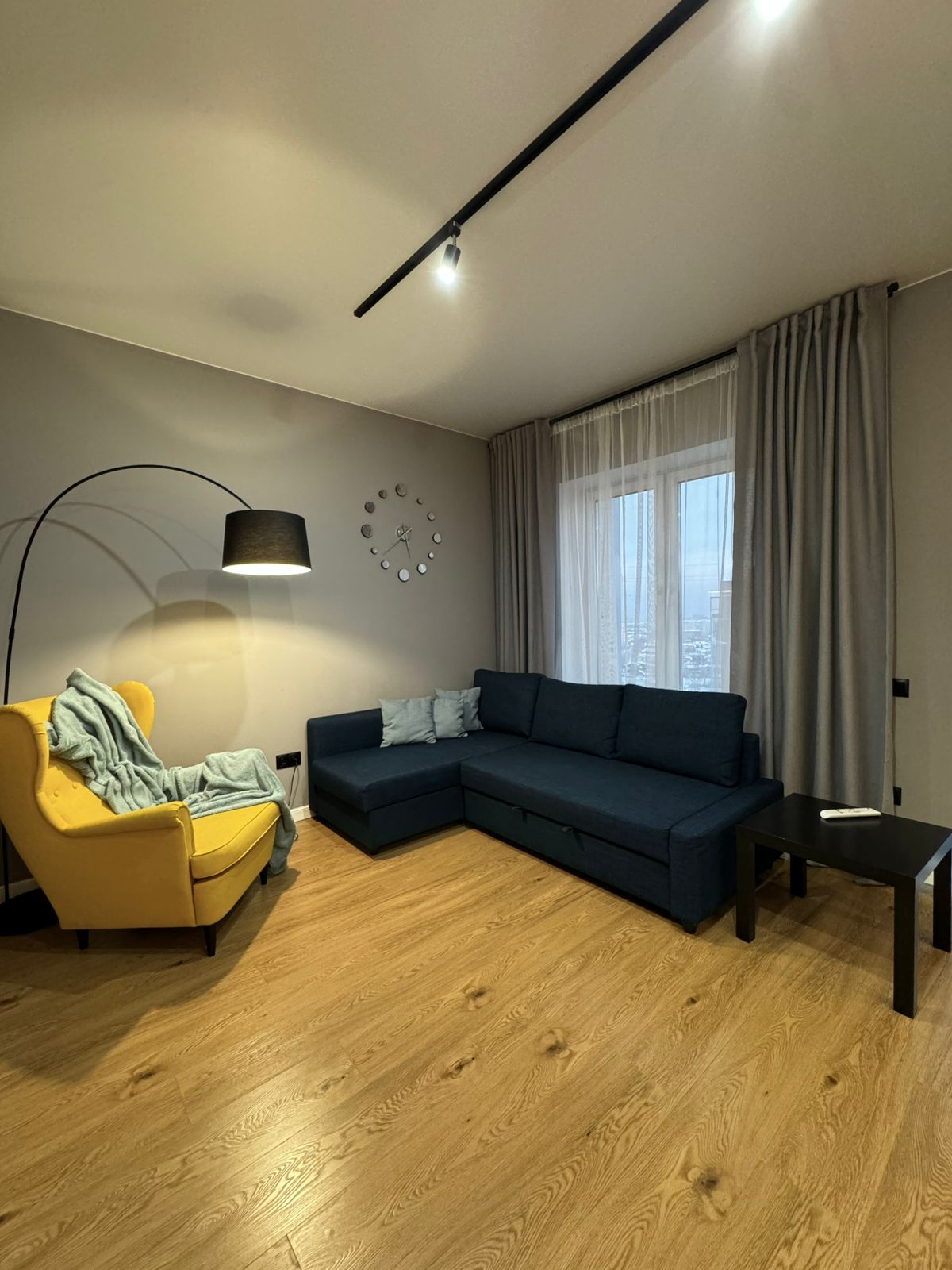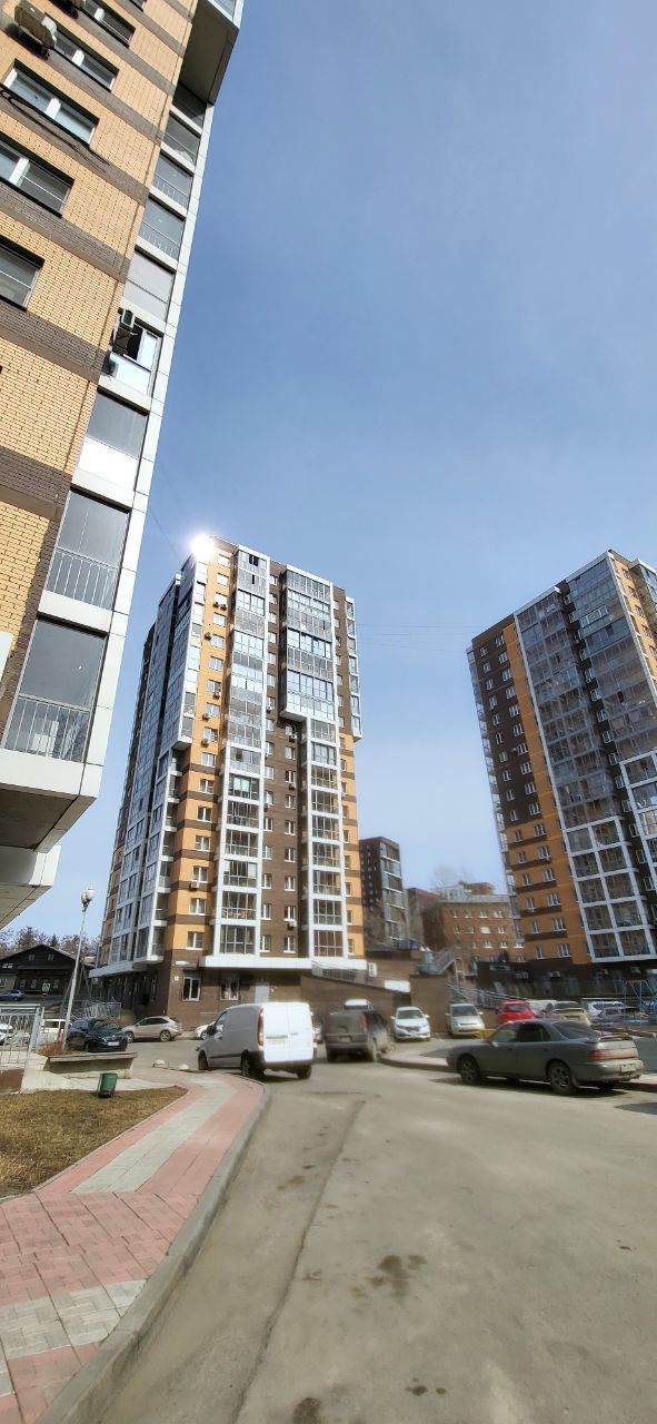 Общая площадь с объединенным балконом — 43,5 м². Квартира находится на 17 этаже, окна панорамные.