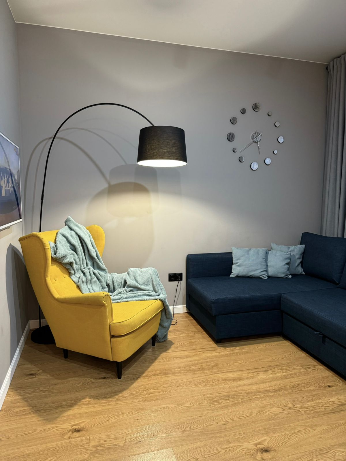 В гостиной — раскладной диван, кресло, торшер, телевизор и журнальный столик.