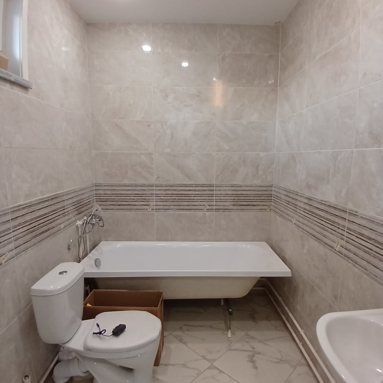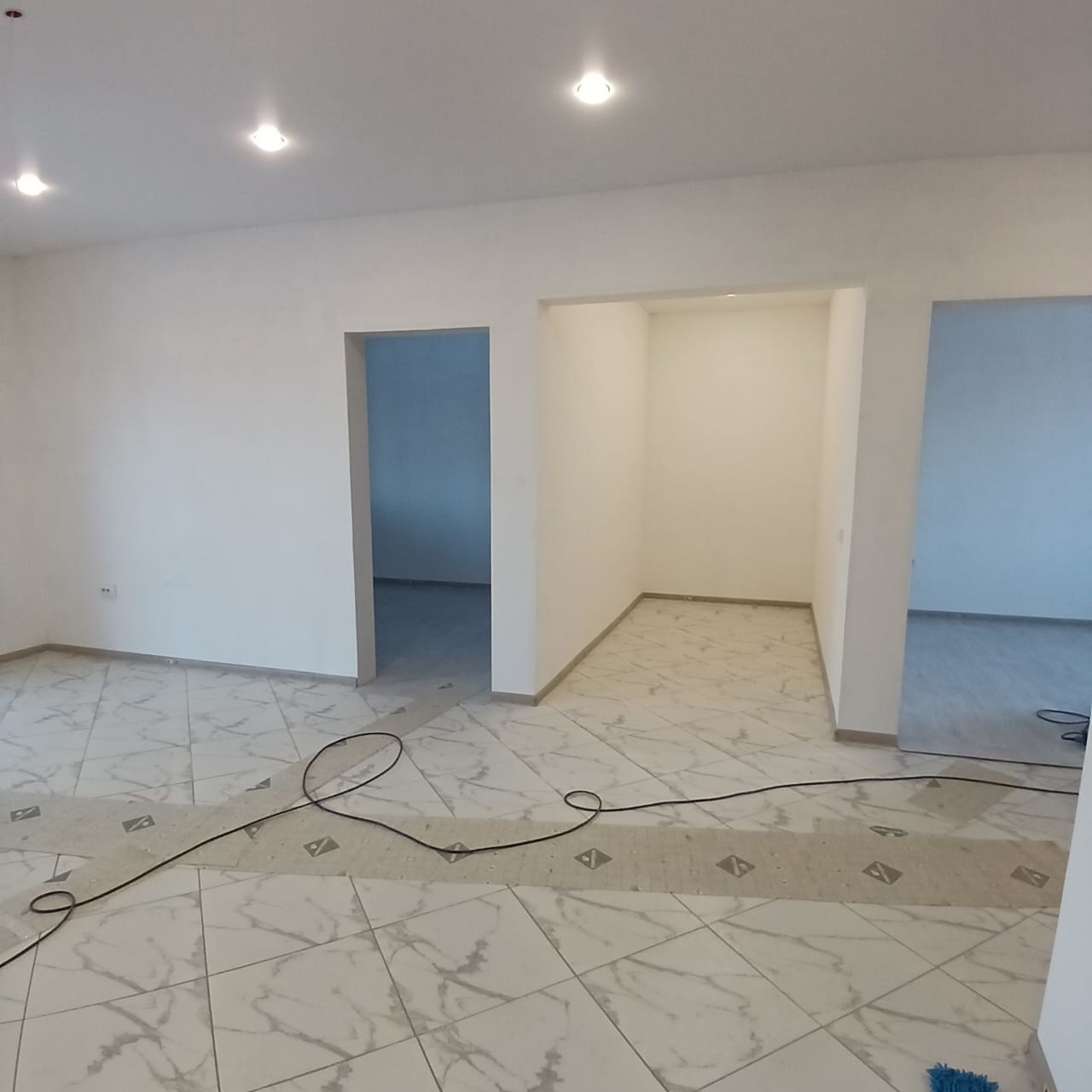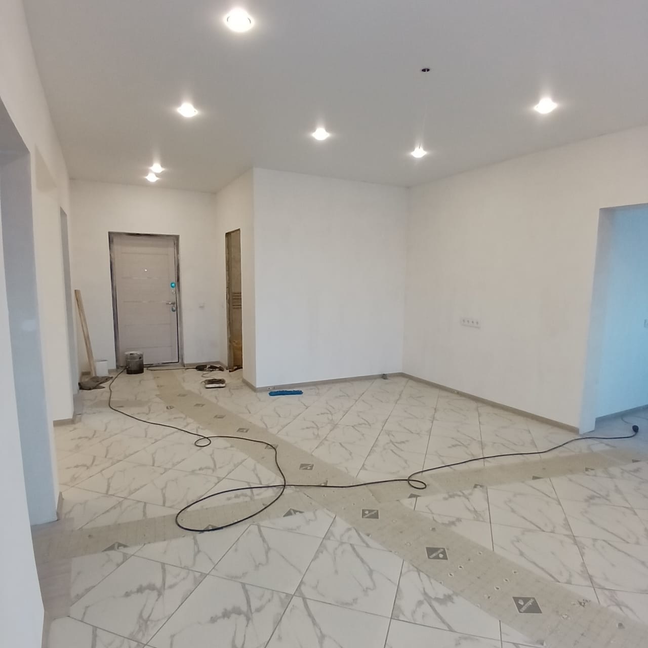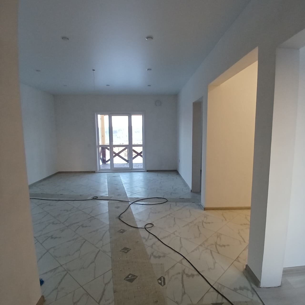 - В доме пластиковые окна, хороший ремонт, натяжные потолки, электрика заведена, вода тоже, пол покрыт плиткой в кухне-гостиной и прихожей, в спальнях линолеум;